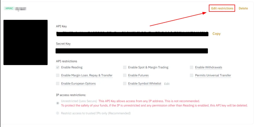 6. To set API key restrictions. Click “Edit Restrictions” again