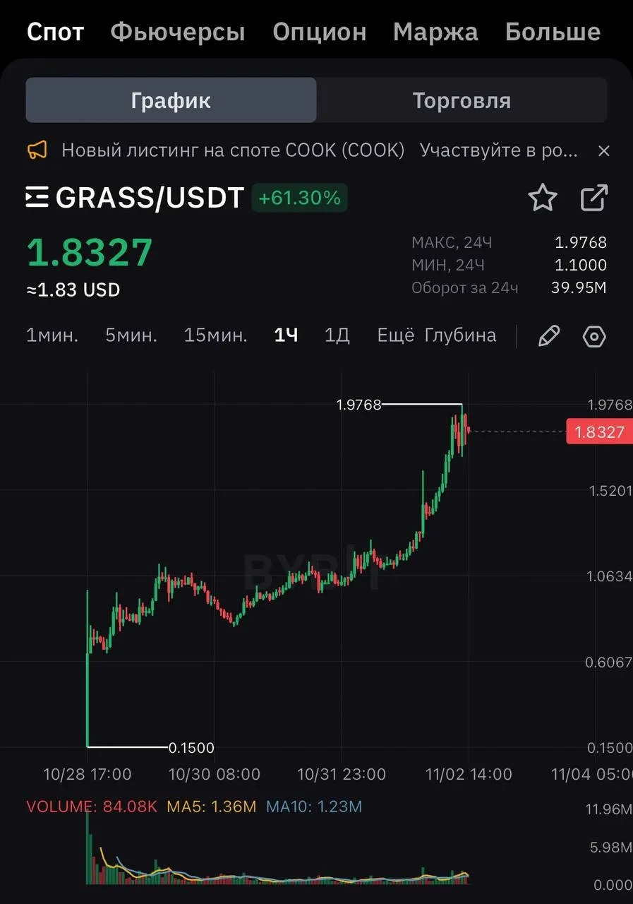 At the time of listing, the price per $Grass token ranged from $0.8 to $1. After the listing, the price dropped to $0.65 in the moment. A large number of users who received airdrop probably decided to sell their tokens immediately on the listing, which caused the asset’s price to decline after the listing, but then the asset rose in value for several days in a row. At the moment (November 2, 2024), the rate is firmly above the strong $1 mark and is trading in the range of $1.5-2 per token. The peak price (all time high-ATH) of the asset for all time past is - $1.98, the minimum (all time low-ATL) is - $0.65. The volatility of the coin and trading volumes are still high, so it is worth to be especially careful when making trading decisions and observe the risks involved.