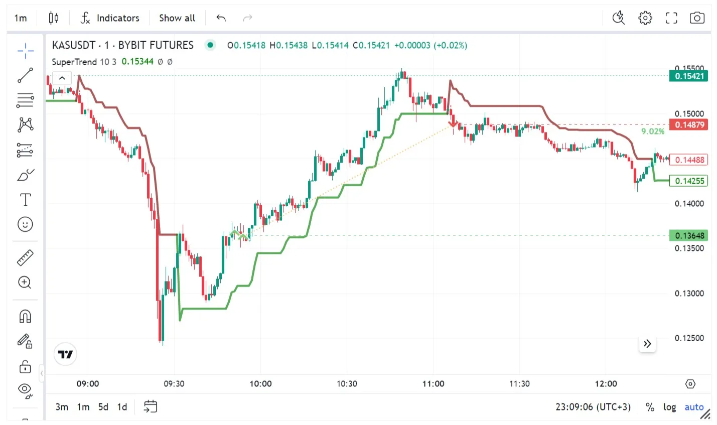 When the Supertrend changes direction (price crossing + indicator color change), it indicates a trend change.