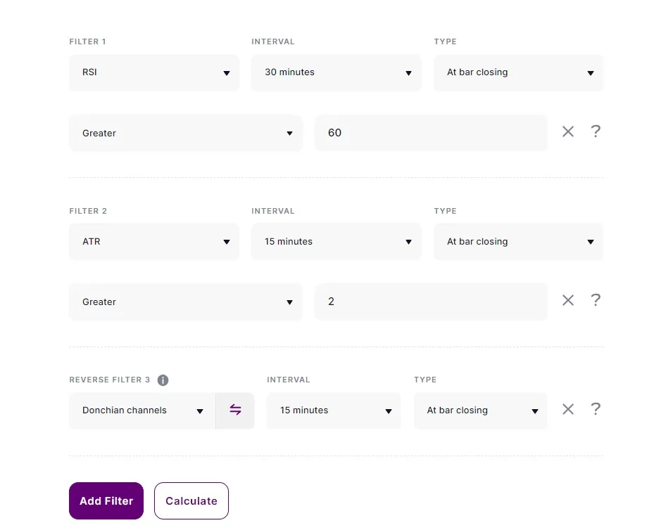 For example: a trader has determined for himself that his chosen asset breaks its levels only when the RSI indicator on the 30-minute timeframe shows overbought, the ATR value is above 2 and when the Donchian channel is broken. Most importantly, all of these bases must be satisfied.