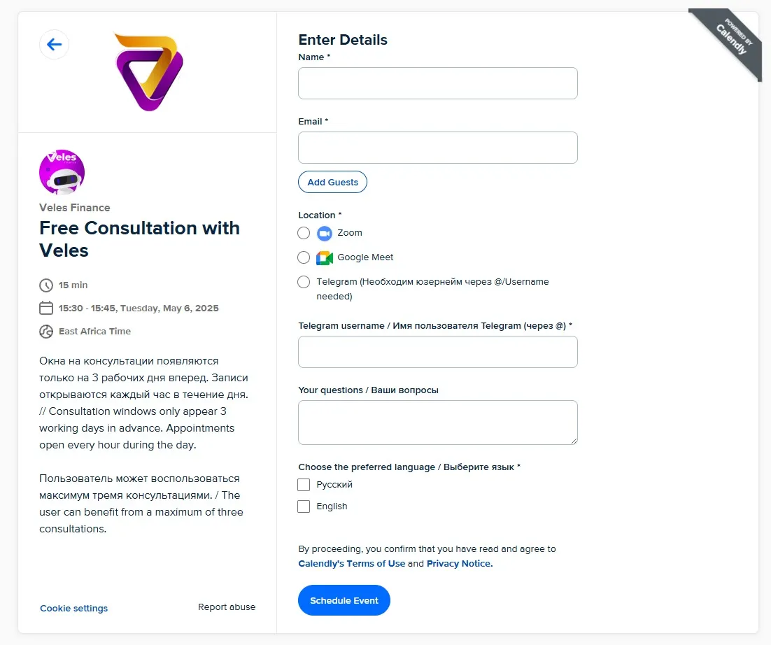 You can choose an available slot on the website and get personalized recommendations on how to configure the Veles bot and more.