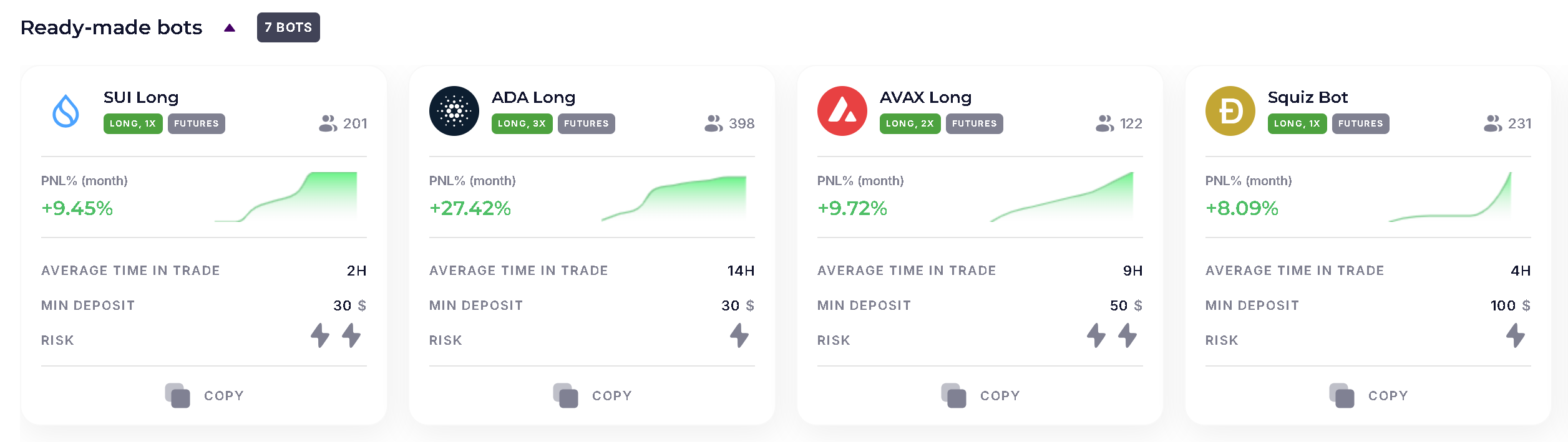 | Bot | Chart | PNL% (Month) | Average Time In a Deal | Minimum Deposit | Risk | |