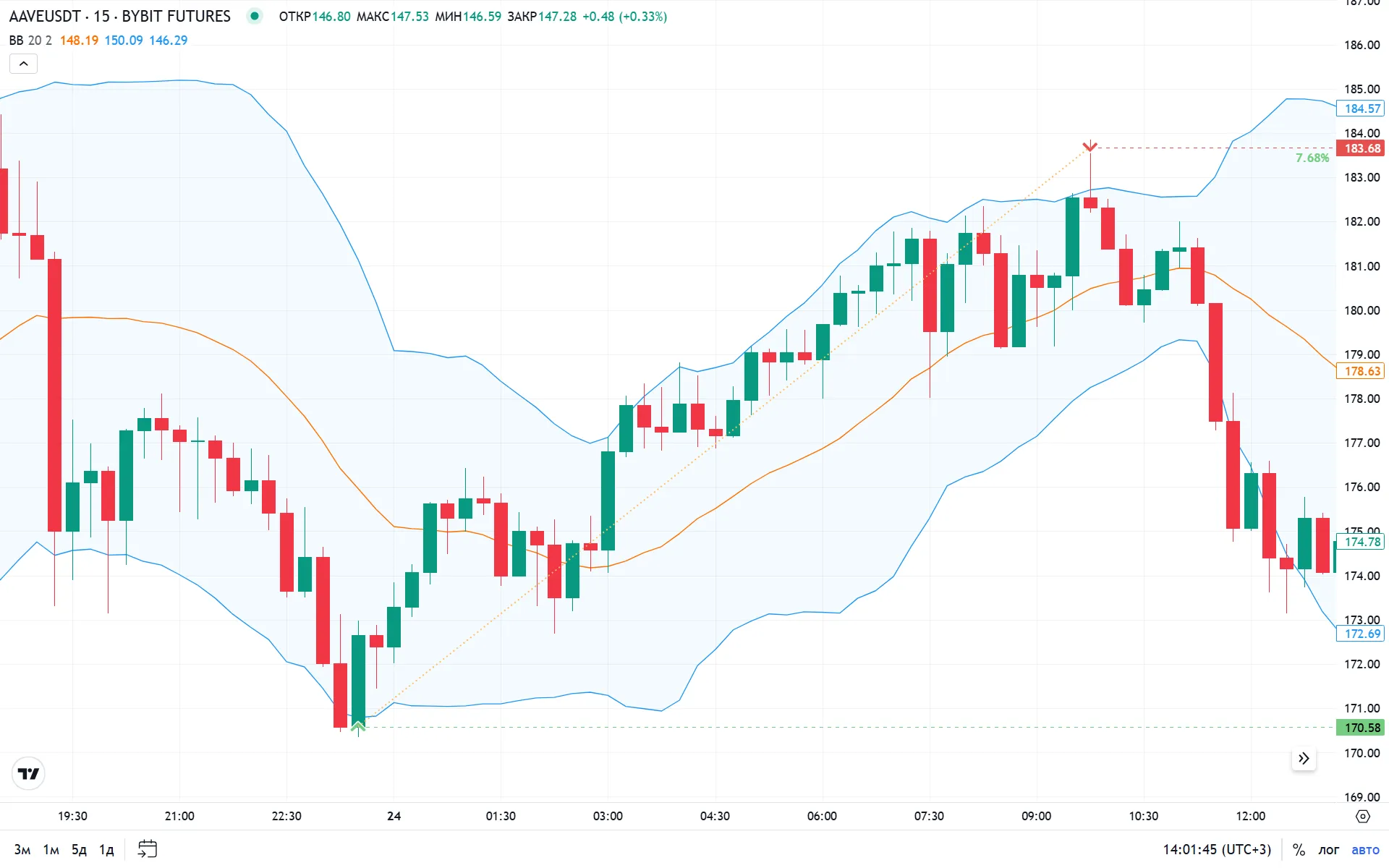 • При падении: цена падает к нижней полосе, что может быть сигналом к покупке.