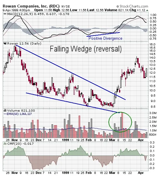 1. Что происходит после паттерна падающий клин?