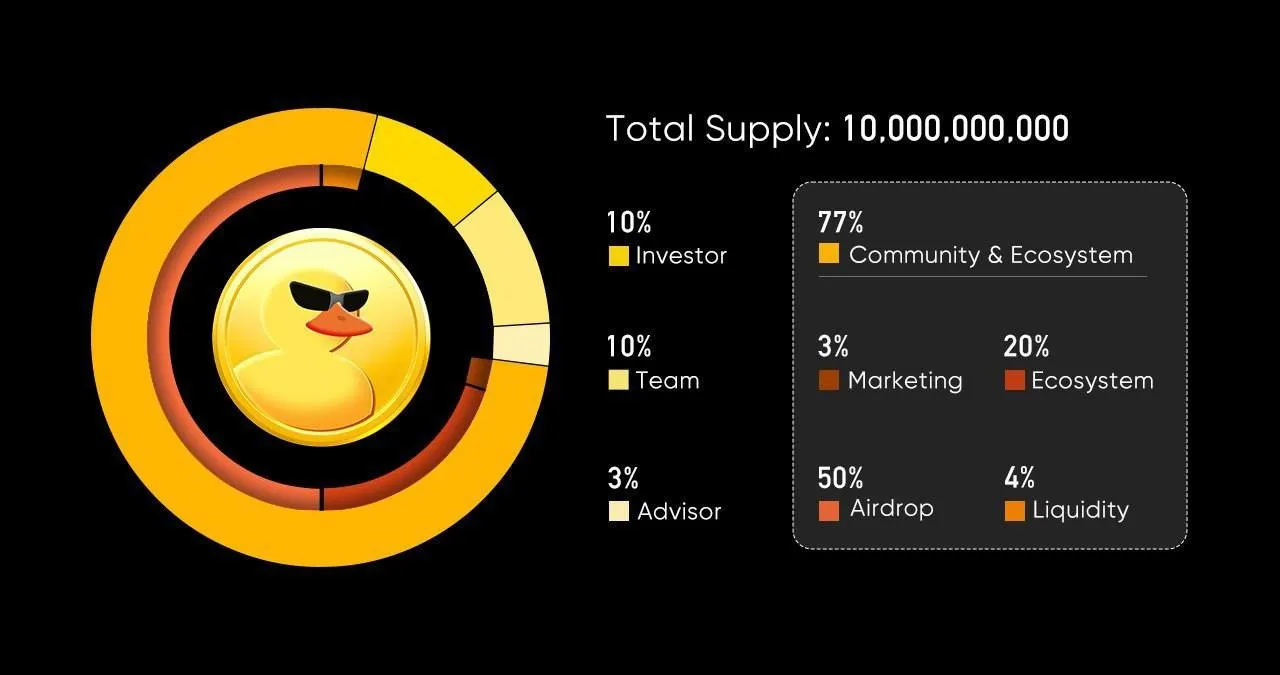 Токен $DUCK — это основной актив экосистемы DuckChain. Его токеномика включает: