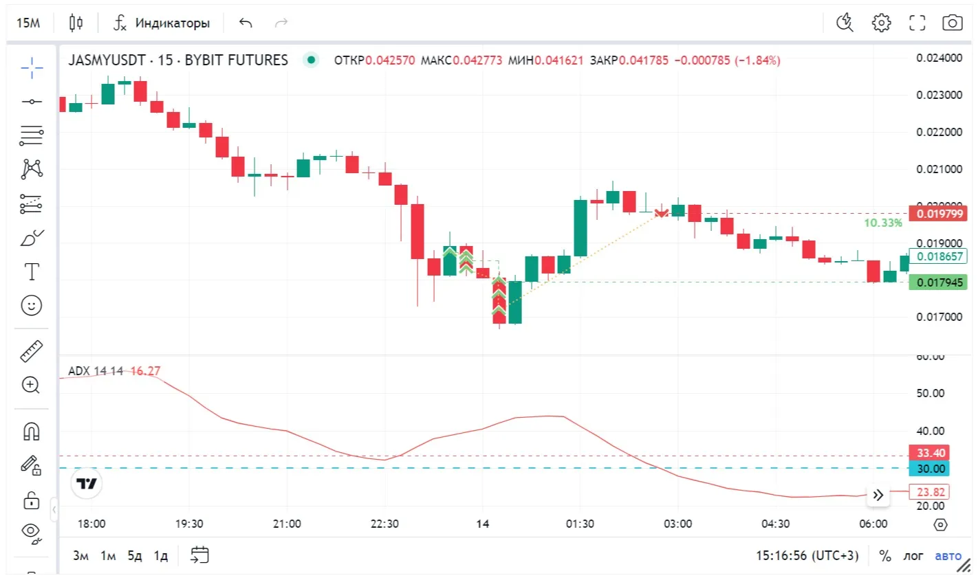 Линия –DI (отрицательное направление движения): Показывает среднее значение отрицательных изменений цен за тот же период.