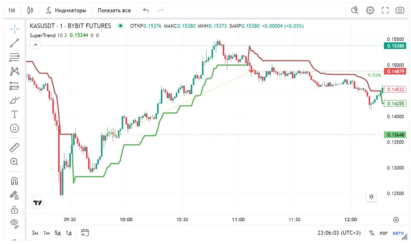 Когда Supertrend меняет направление (пересечение ценой + изменение цвета индикатора), это указывает на смену тренда.