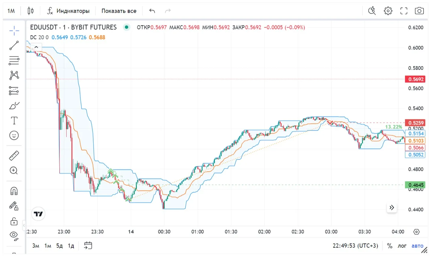 - Мы используем его для определения потенциальных уровней поддержки и сопротивления, а также разворота тренда на одном из самых младших таймфреймов - м1. Когда цена пробивает верхнюю линию, это может указывать на начало восходящего тренда.