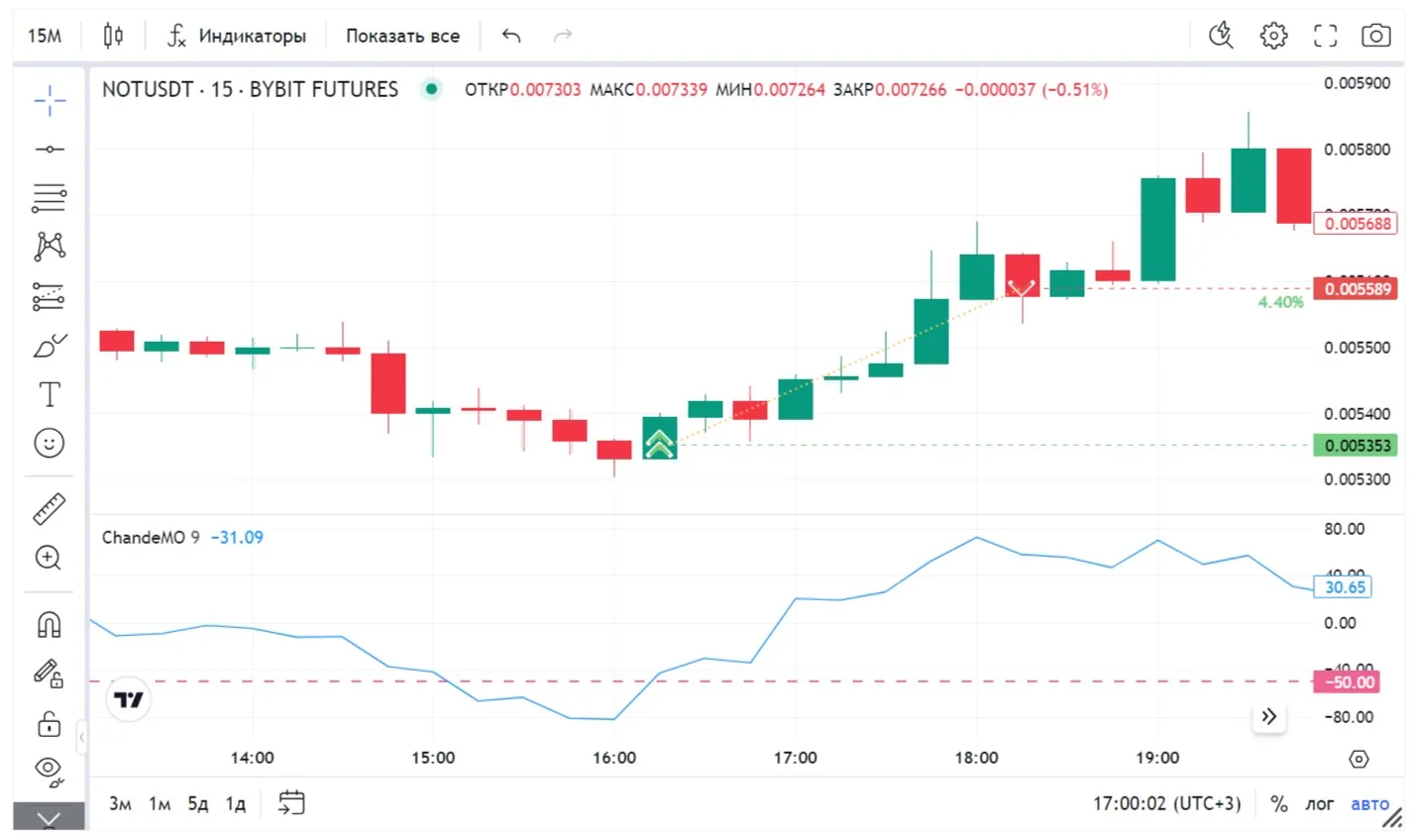 - Когда осциллятор находится в области отрицательных значений, это указывает на то, что текущая цена закрытия ниже цены закрытия за определенный период времени, что в свою очередь может свидетельствовать о нисходящем тренде или о том, что рынок перепродан и скоро может произойти восстановление. Мы используем стандартный уровень –50 на таймфрейме м15: будем торговать от перепроданности и попробуем войти в сделку на потенциальном развороте вверх.