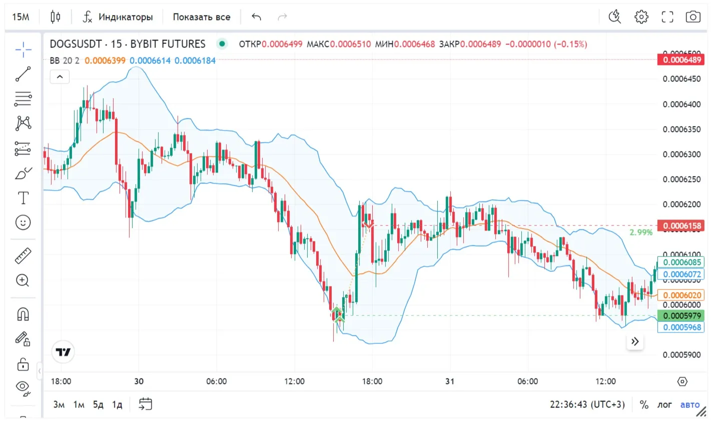 - Используем Полосы Боллинджера на таймфрейме м15. Когда цена приближается к нижней полосе, это может подтверждать зону перепроданности и указывать на вероятный разворот вверх.