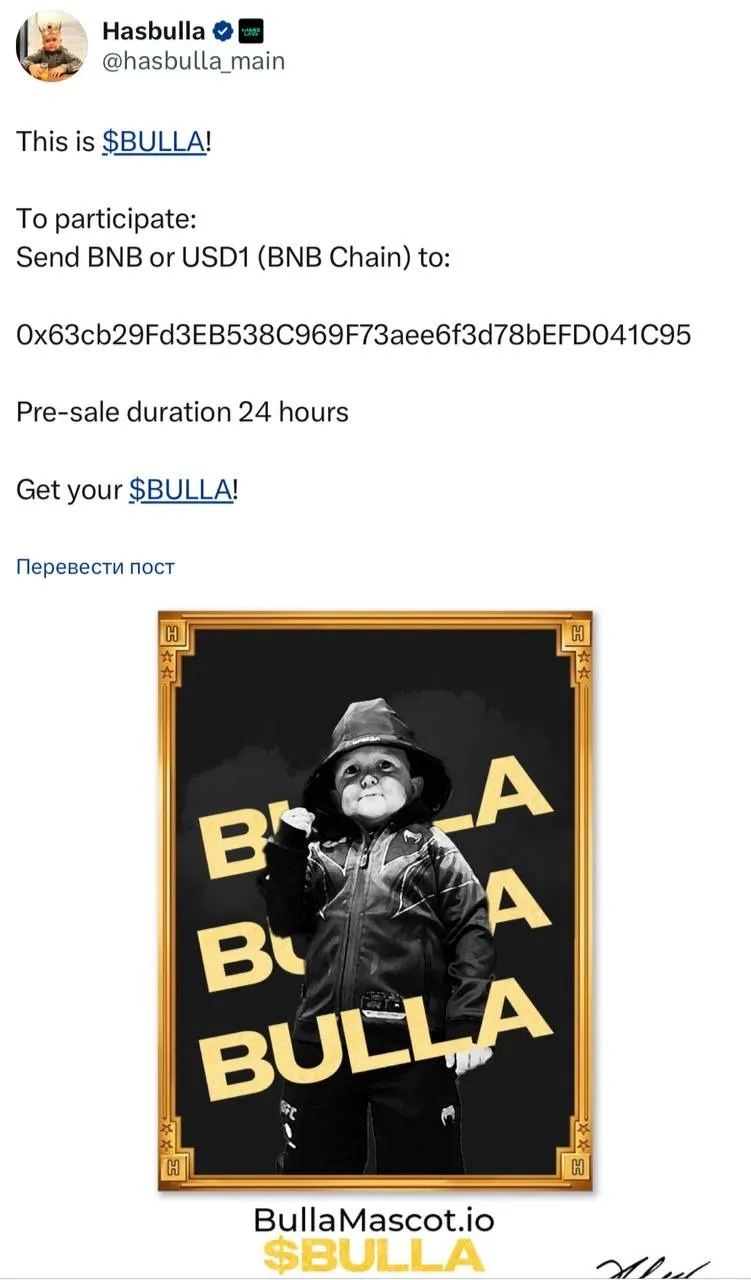 $BULLA – это мемкоин, созданный в честь Хасбика. В последствии у команды есть идеи по интеграции этого токена в свою экосистему.