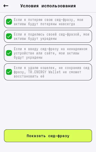 Согласиться с условиями и нажать на кнопку “Показать сид-фразу”.