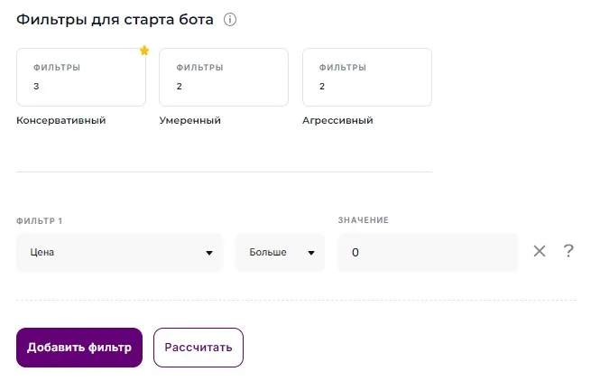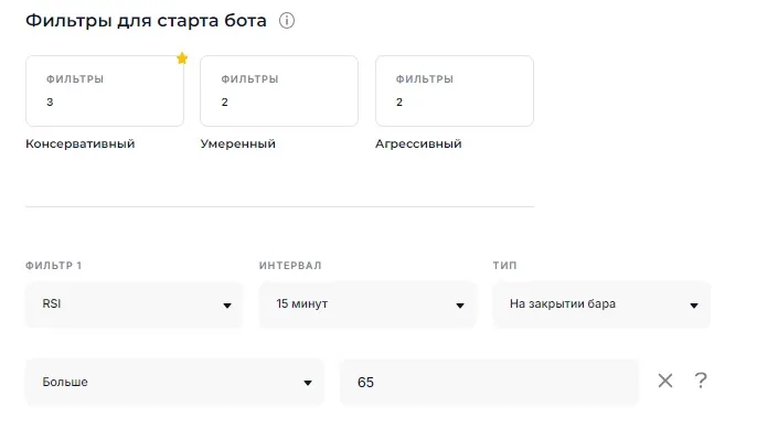 После этого переходим к настройке сигнала для запуска бота. В этом случае можно пойти двумя путями: выбрать сигнал для быстрого входа, задав Фильтр Цена > 0, в этом случае бот моментально начнет торговлю.