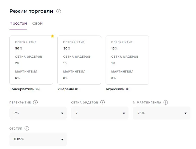 Изначально необходимо настроить сетку перекрытия, задав диапазон, в котором бот будет выкупать распроданный объем. Выбирайте перекрытие от 7% до 20%. Такая сетка позволит эффективно набраться. Параметр Мартингейла отвечает за повышение объема в каждом последующем ордере. Таким образом можно получить хорошую среднюю точку входа.