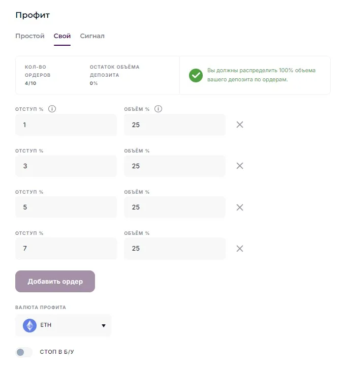 В настройке профита выставляем аналогичную сетку, как и в Режиме Торговли. В качестве валюты профита выбирайте необходимый токен или USDT, если хотите зарабатывать на разнице в цене.