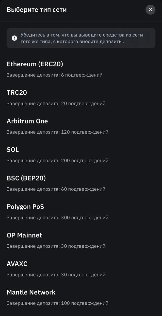 Выбрана правильная сеть при выводе (биржи не восстанавливают ошибочные переводы).