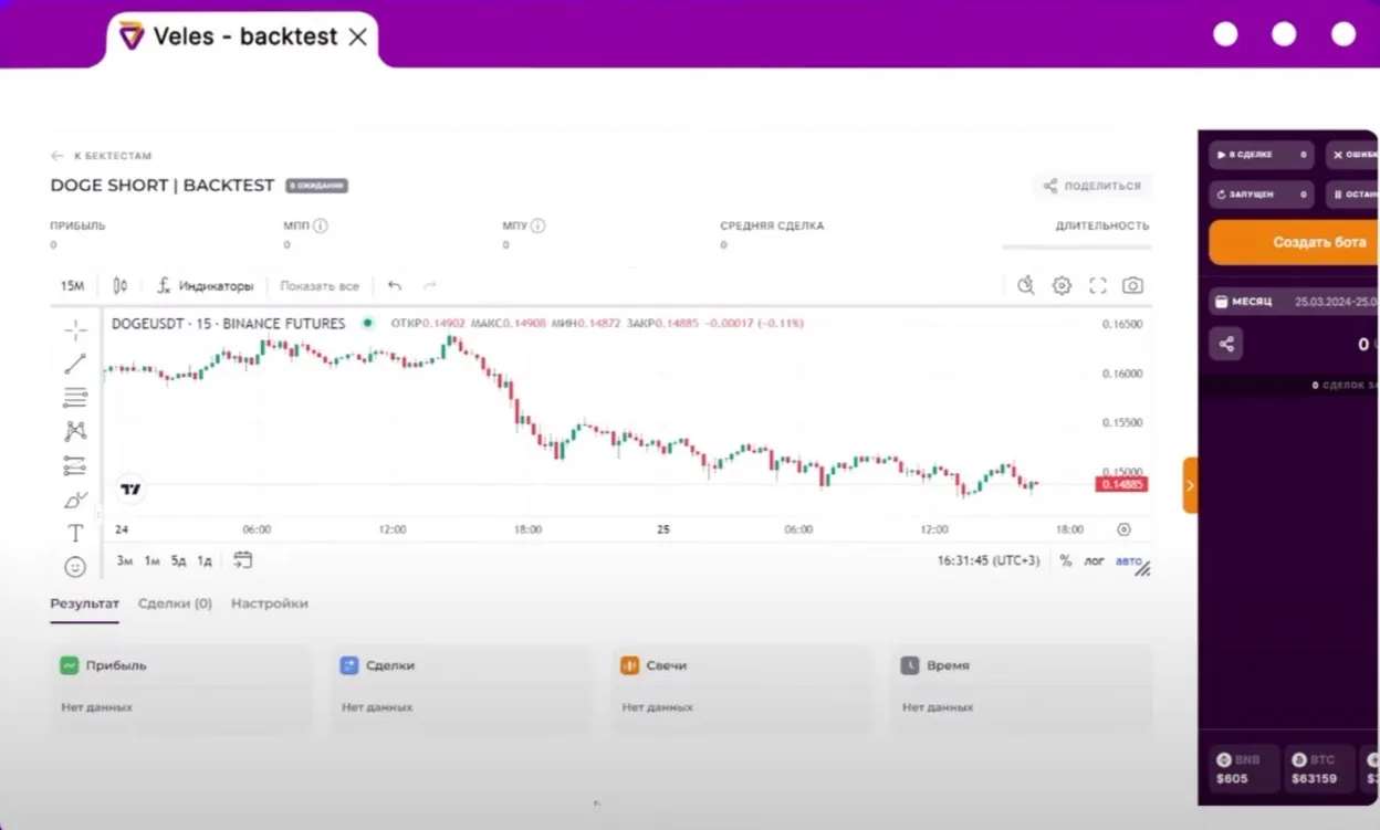На платформе Veles Finance проведение бэктестов происходит автоматически, потому от пользователей не требуется владение навыками программирования. После регистрации в личном кабинете пользователь получает полный доступ к бэктестам, а также приветственный бонус в 5$ для торговли крипто-ботами.