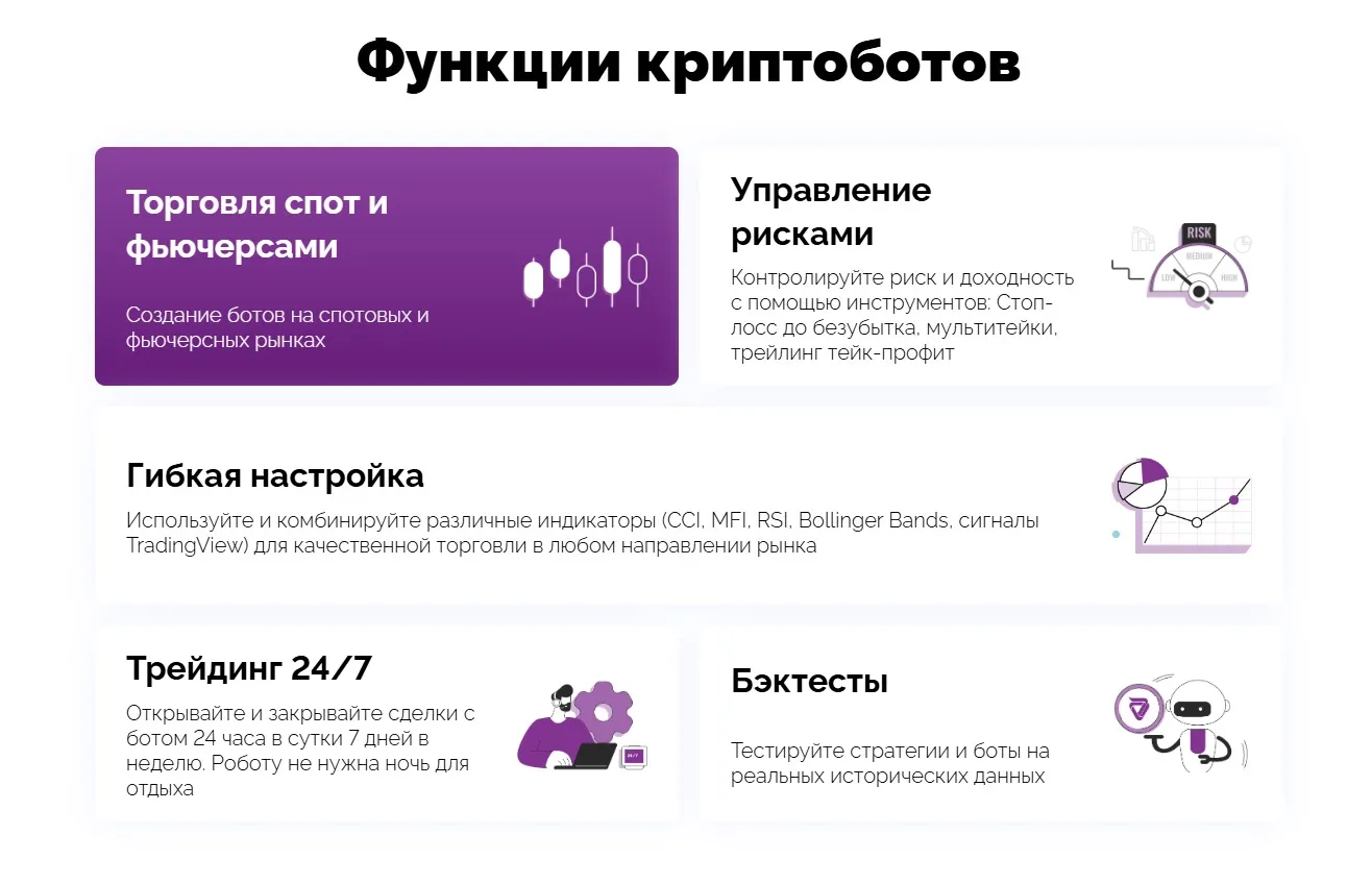 Чтобы минимизировать человеческий фактор и усилить результат, всё больше пользователей прибегают к помощи ботов для трейдинга криптовалют. Они действуют по заданным стратегиям, автоматически совершают сделки и управляют рисками в режиме 24/7.