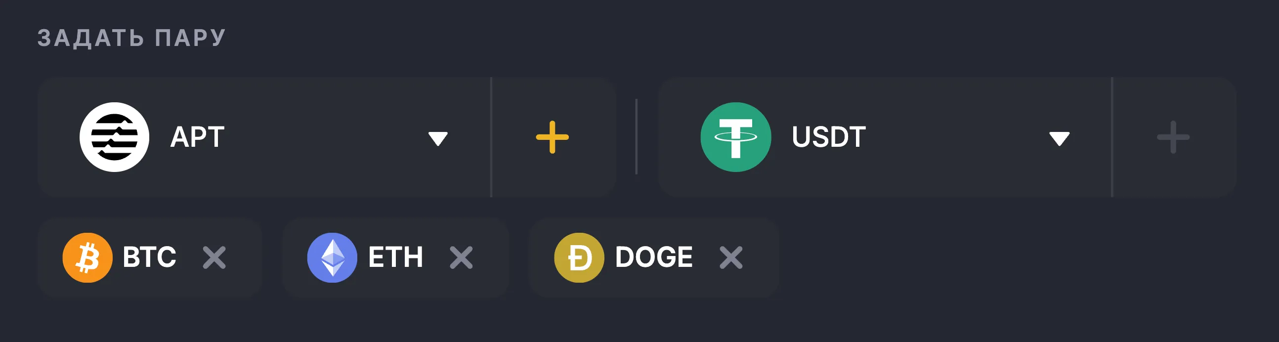 - Добавьте нужные монеты. Старайтесь выбирать активы с похожим характером движения — так стратегия будет работать стабильнее.