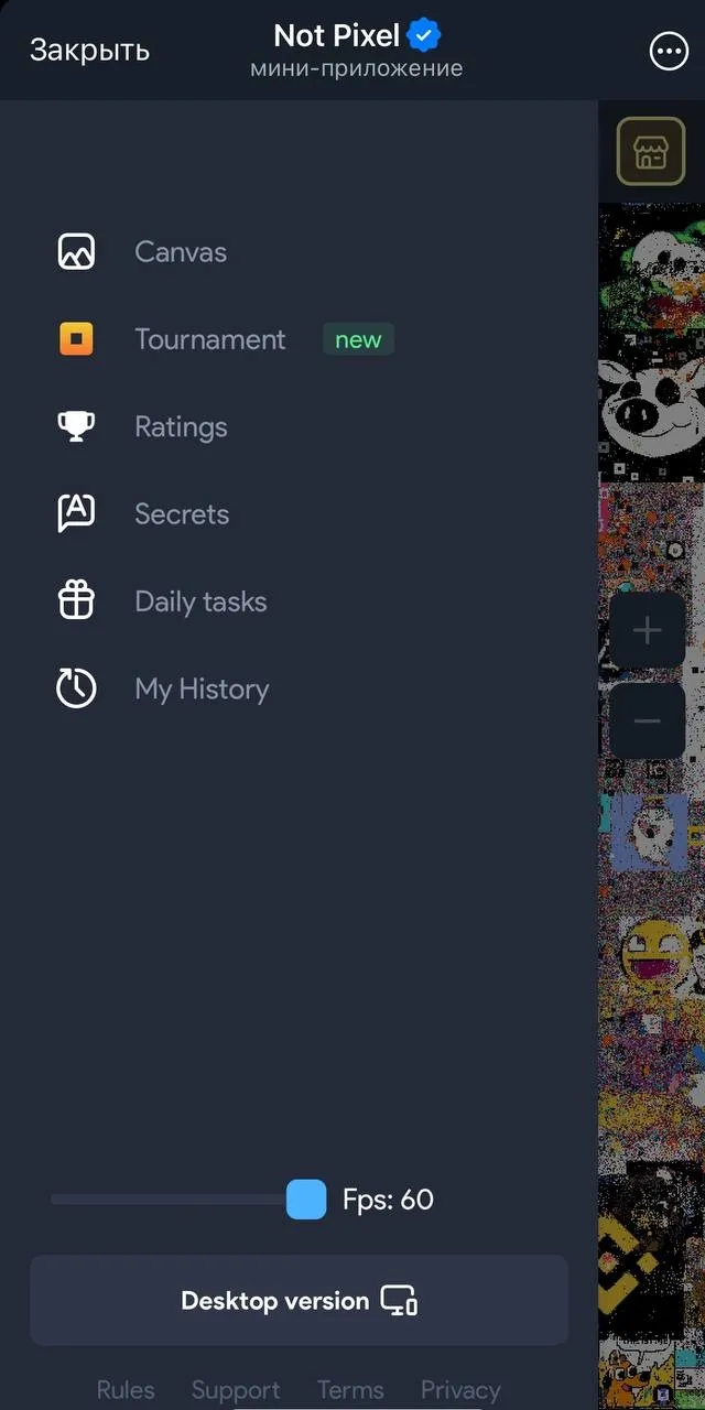 В центре верхней панели расположен ваш игровой профиль, в котором отображаются ваши PX поинты. Также, здесь находятся два раздела Tasks – задания, за выполнение которых начисляют игровую валюту и Boosts – здесь есть 3 буста (Награда за перекраску пикселей, Скорость восстановления заряда, Лимит зарядов). Улучшить их можно за заработанные поинты. В правом углу верхней панели расположен раздел Shop – магазин, где можно за Telegram stars приобрести игровой инвентарь, повышающий вашу эффективность по добыче поинтов.