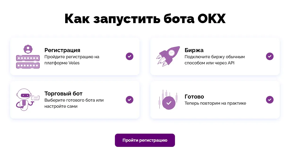 Кроме того, как работает OKX вызывает доверие у трейдеров по всему миру благодаря прозрачной системе комиссий, высокой скорости исполнения ордеров и продвинутым возможностям риск-менеджмента. Для Veles также важно, чтобы пользователи могли запускать OKX ботов быстро и безопасно, не тратя время на длительную настройку вручную.