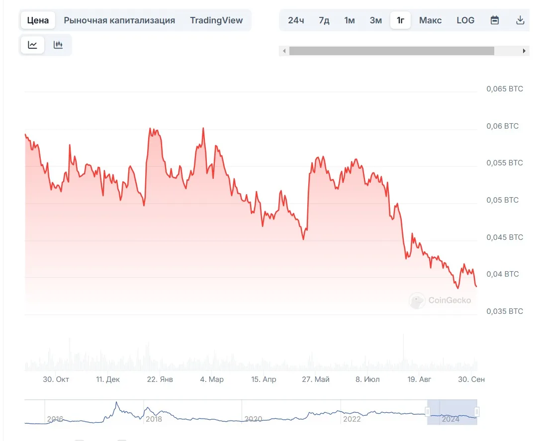 Примерно так выглядит график курса большинства альтернативных криптовалют к биткоину, если взять промежуток в год или несколько лет. Отсюда можно сделать вывод, что список “лучшие криптовалюты 2024” должен возглавить биткоин.