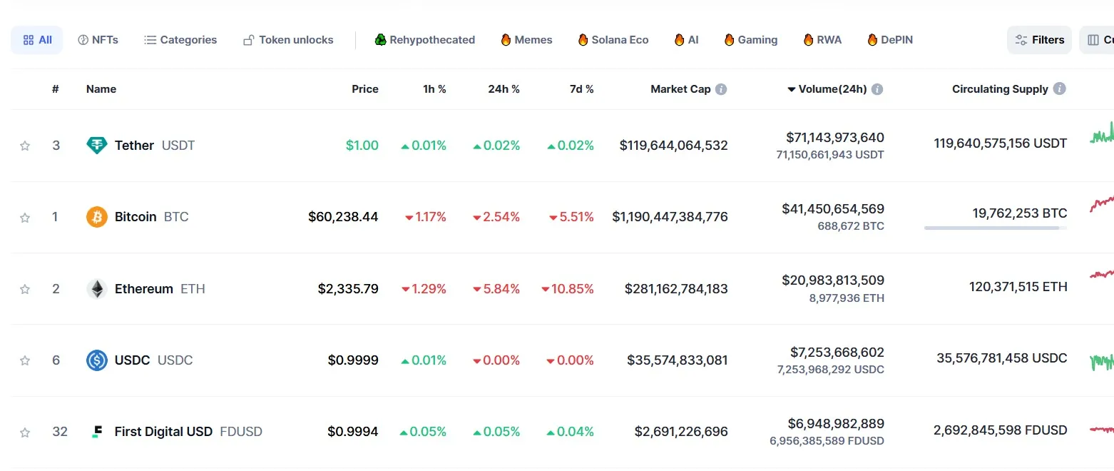 USDT - это криптовалюта, удерживающая первое место по ежедневному объёму торгов (по данным Coinmarketcap).