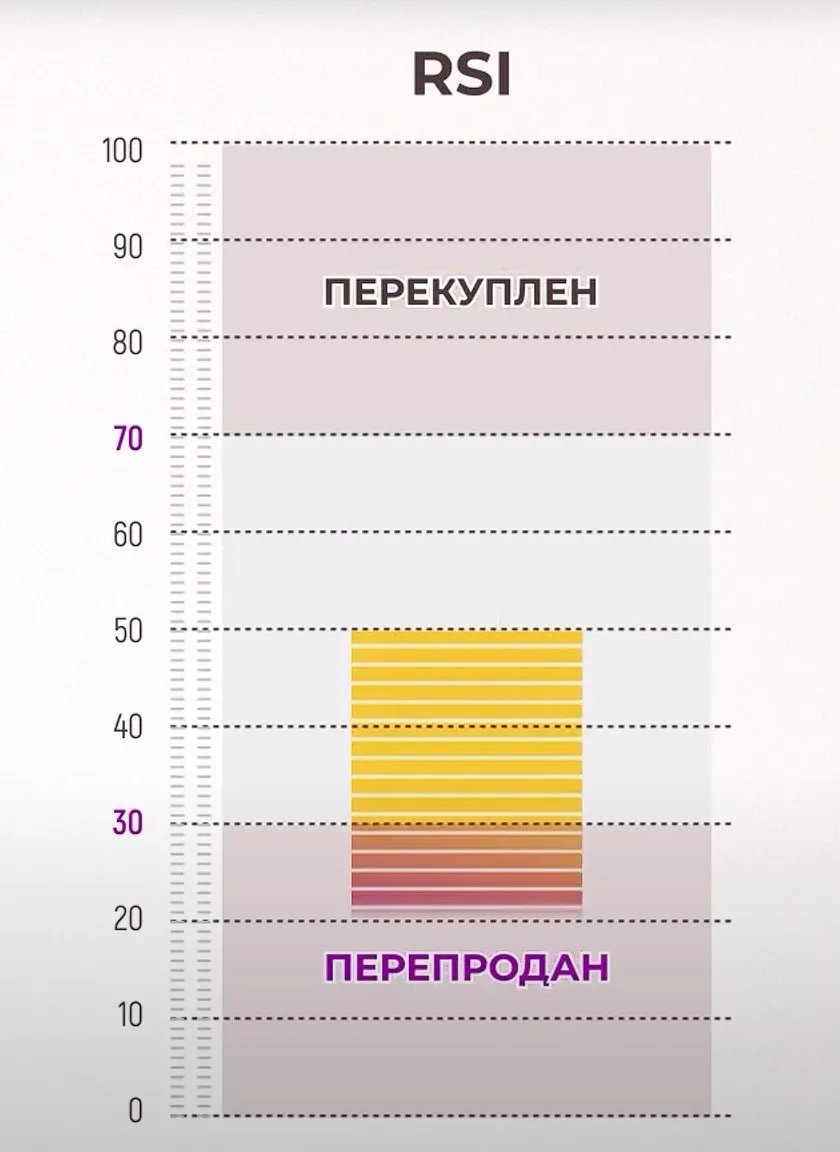 – Значение выше 70 показывает перекупленность актива и его вероятное снижение цены.
