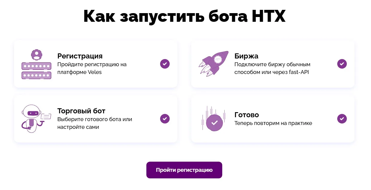 После подключения API задайте свои торговые параметры или выберите стратегию на платформе Veles. Доступны разные виды торговых стратегий: трендовые, скальпинг, арбитраж, DCA, GRID-боты — все они оптимизированы под биржу HTX. Настройте параметры и запустите htx бота. Сразу же после запуска, бот начнет совершать сделки автоматически, без вашего прямого участия в торговле.