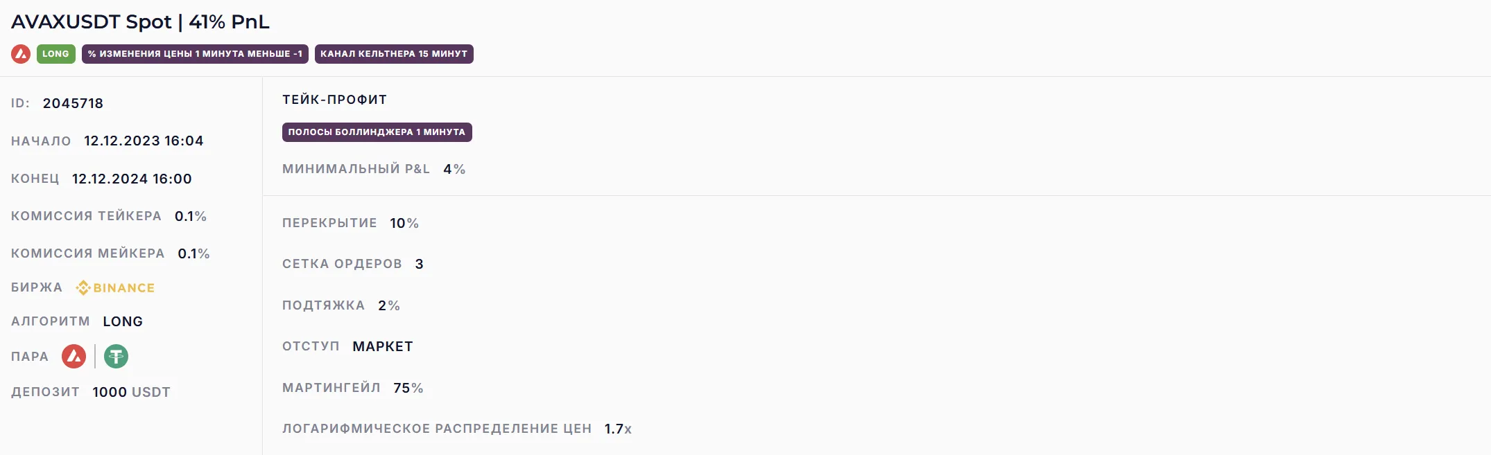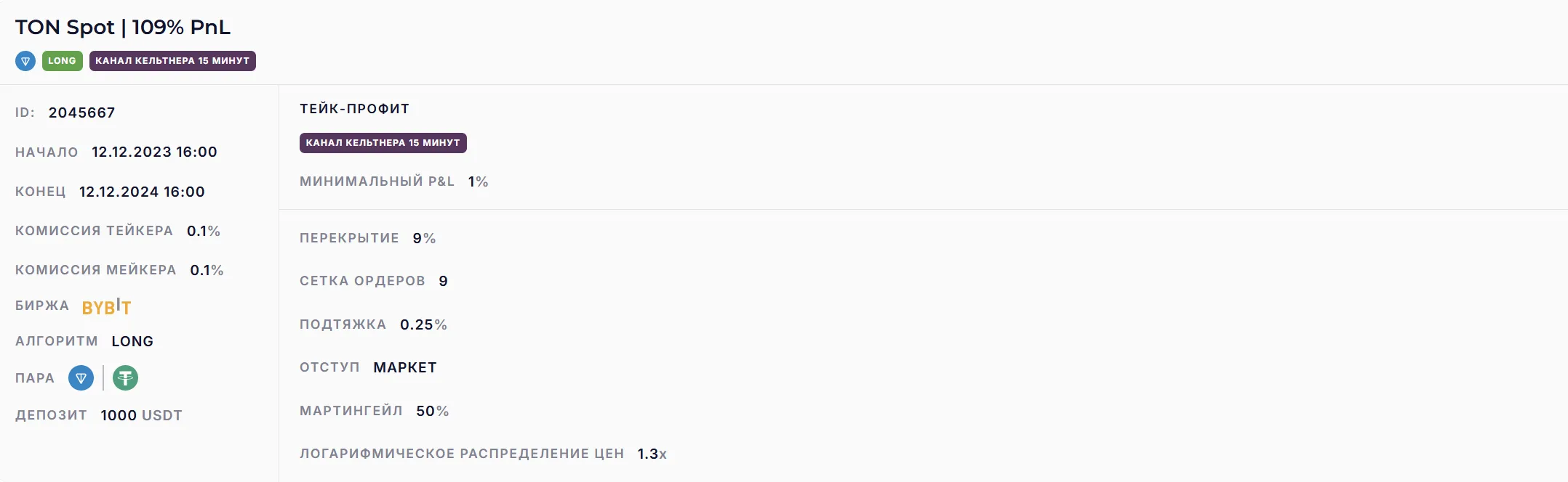 Канальный бот с частыми сделками, набирает позицию в 9% сетке.