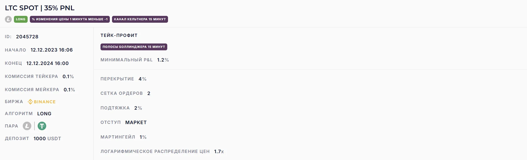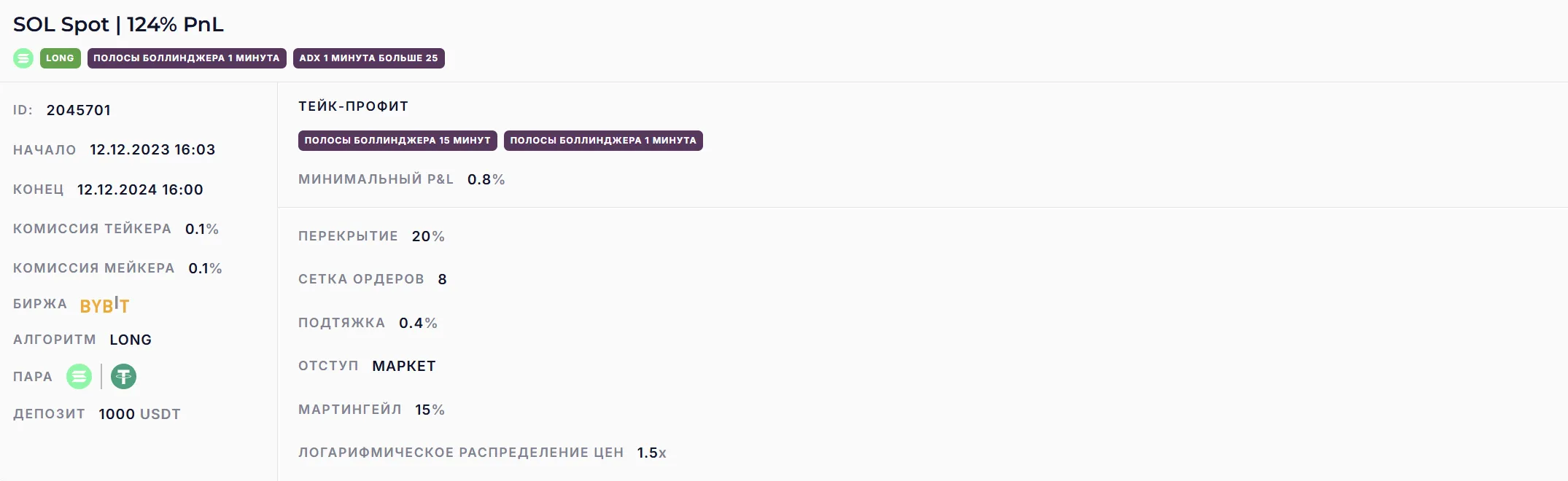 Бот настроенный на торговлю с индикатором Полосы Боллинджера. Набирает позицию в широкой сетке ордеров.