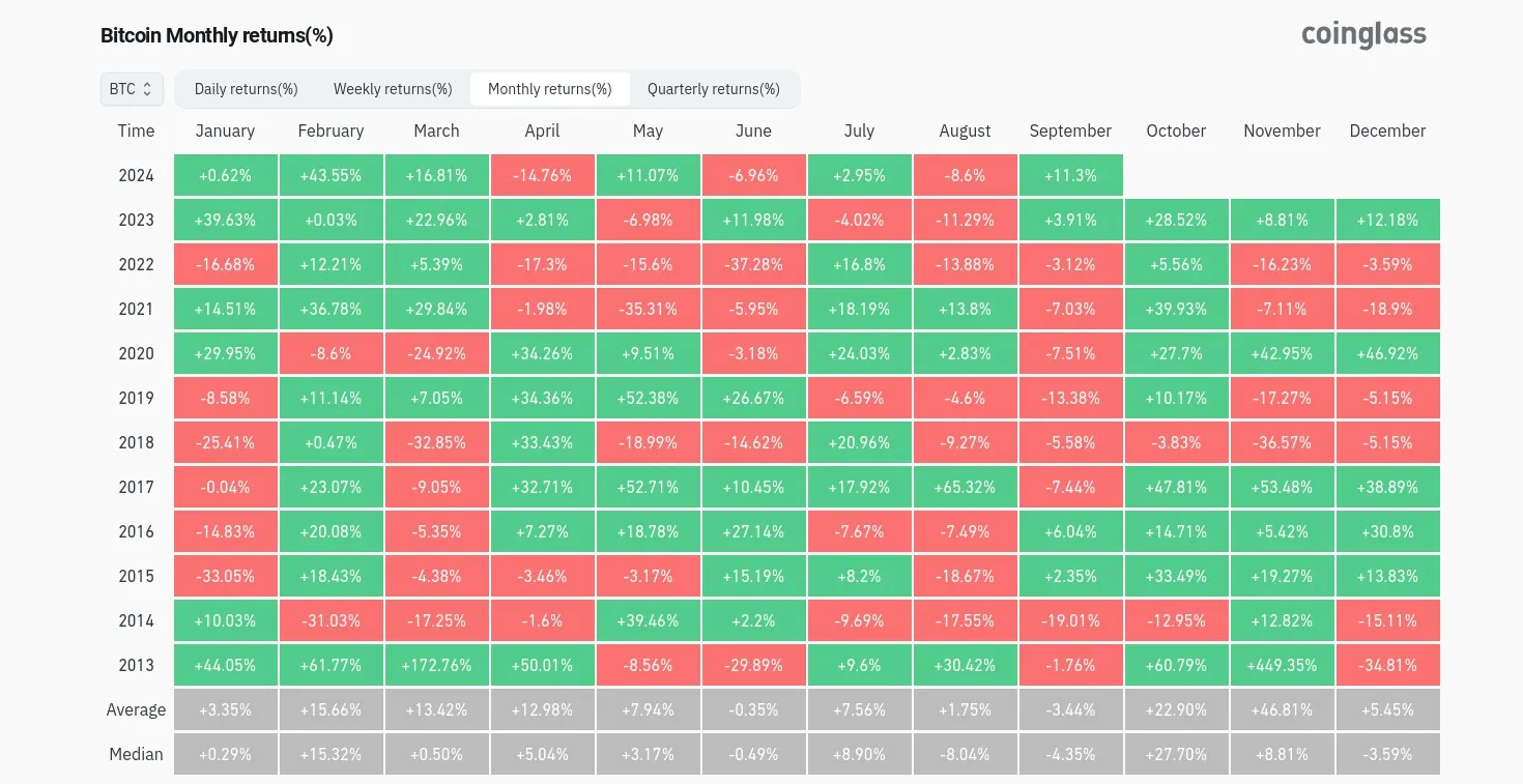 Ежемесячная доходность BTC/USD (скриншот). Источник: CoinGlass
