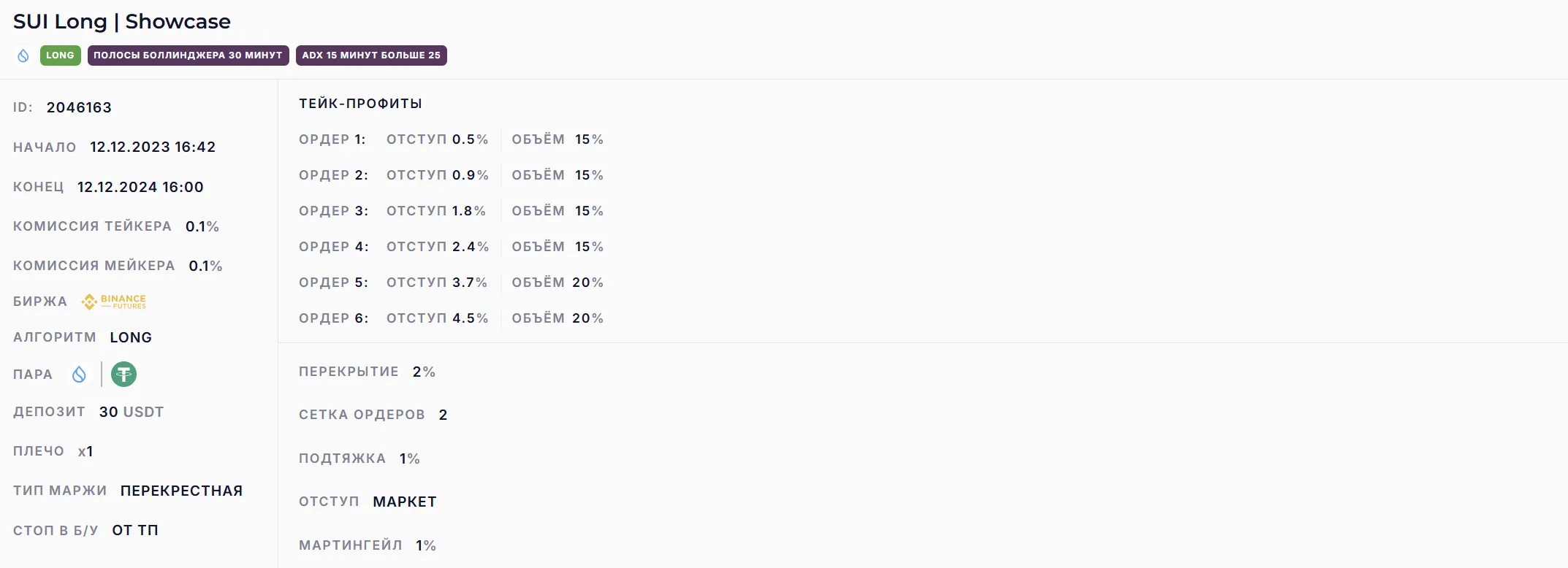 Бот для небольшого баланса в 30 USDT с 3 плечом. Набирает позицию в широкой сетке ордеров, каждый из которых повышается в объеме, позволяя эффективно выходить из позиции.