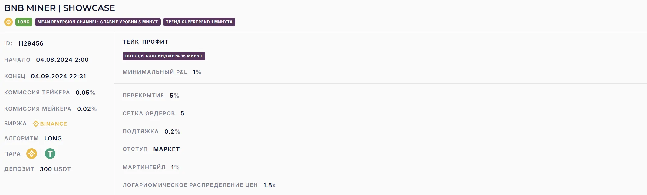 Спотовый бот для заработка BNB для скидки комиссий на Binance. Для торговли выставлен депозит 300 USDT. Для опционального усреднения сделки необходимо иметь в запасе 600 USDT, которые в случае просадки требуется разделить на два самостоятельного усреднения.
