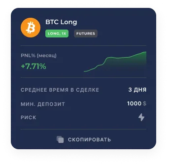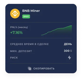 Контр-трендовый бот на открытие сделки после резкого падения цен. В боте воспроизводится механика стратегий “в отскок” и “ловля ножа”. Предназначен для депозита в 100 USDT с 1 плечом. Подойдет для тех, кто предпочитает консервативную торговлю.
