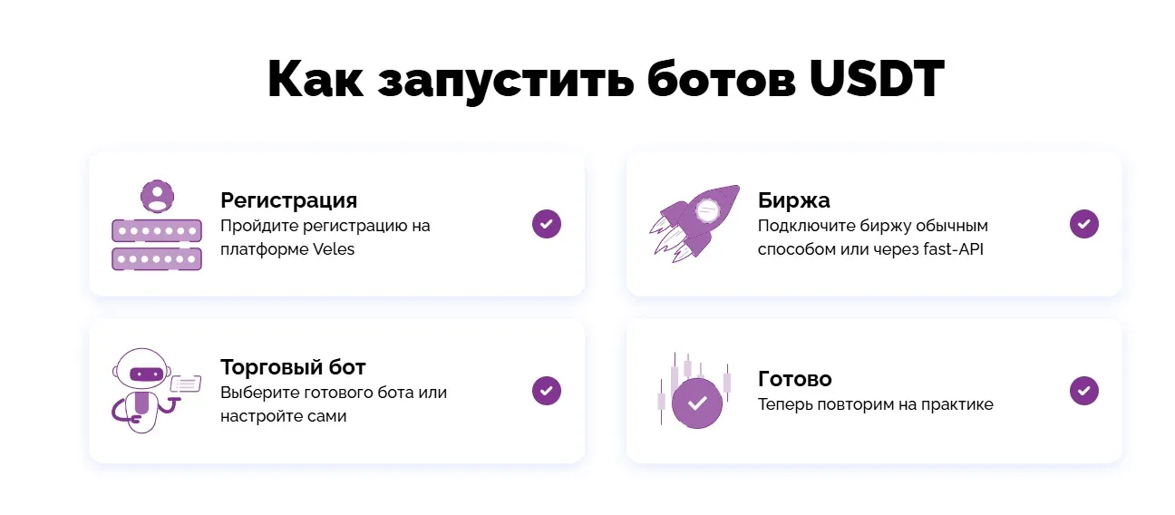 Торговые боты, работающие с USDT, дают возможность для тех, кто хочет торговать без потери своего свободного времени. USDT бот — это автоматизированное программное обеспечение, которое упрощает торговлю и помогает трейдерам осуществлять несколько сделок одновременно, используя USDT в качестве базовой валюты. На платформе Veles можно создать и настроить своего бота для торговли на 6 крупнейших криптобиржах – Bybit, Binance, OKX, Gate.io, HTX, Bing X, кроме того можно выбрать уже готового бота из каталога.