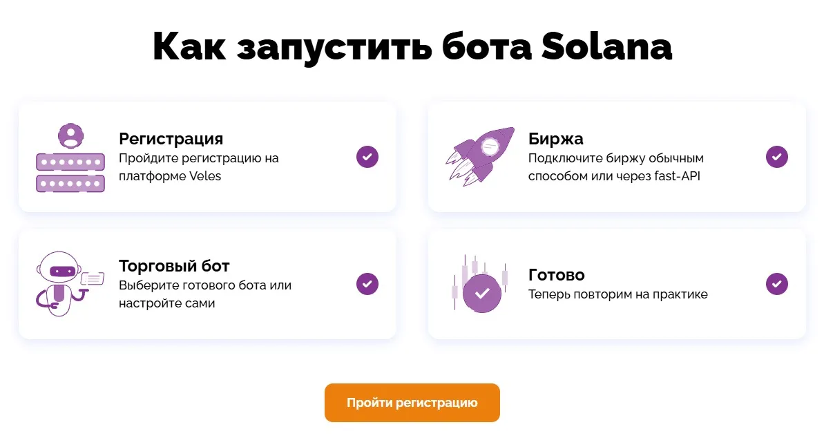 Достаточно зарегистрироваться, подключить API выбранной биржи, выбрать токены (например, SOL, BONK) и применить одну из готовых стратегий Veles.