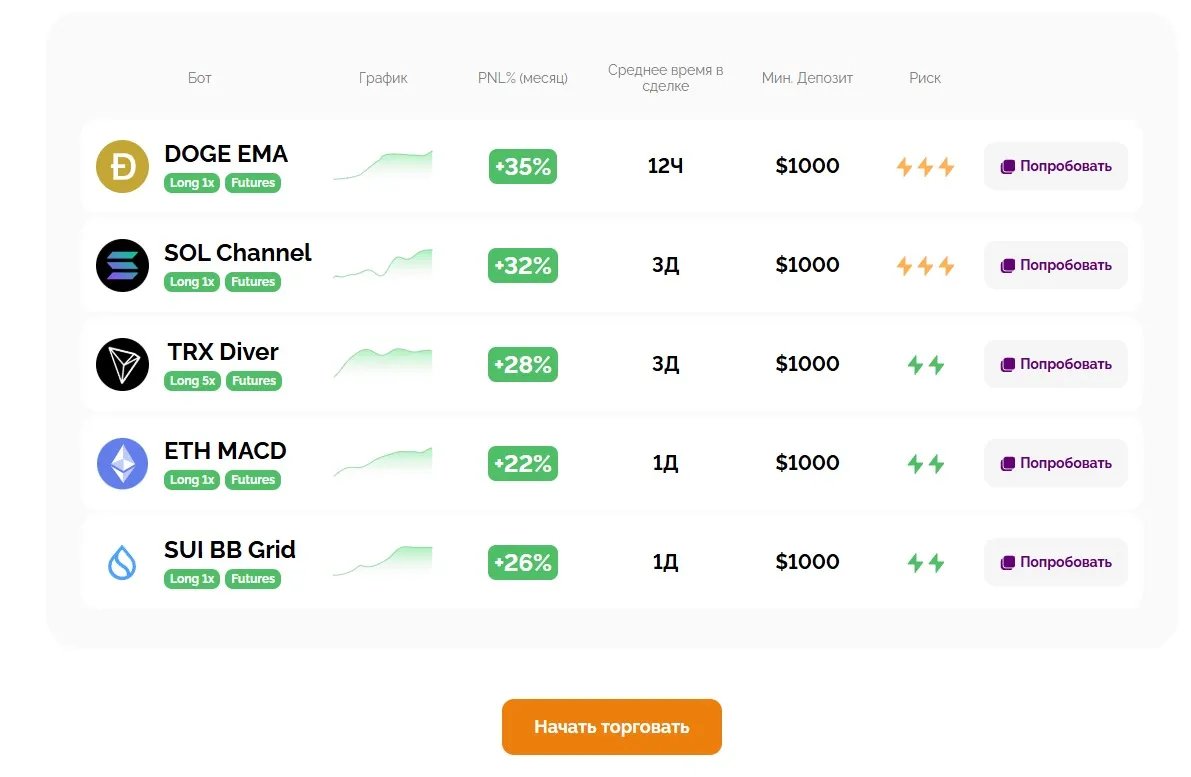 Каждая стратегия строится под конкретные условия: размер депозита, рынок (флэт или тренд), рисковый профиль, торговая пара, таймфрейм. То, что идеально сработало у одного трейдера, может совершенно не подойти вам. Особенно если вы не понимаете, как выбрать стратегию для бота, и просто вставляете настройки наобум.