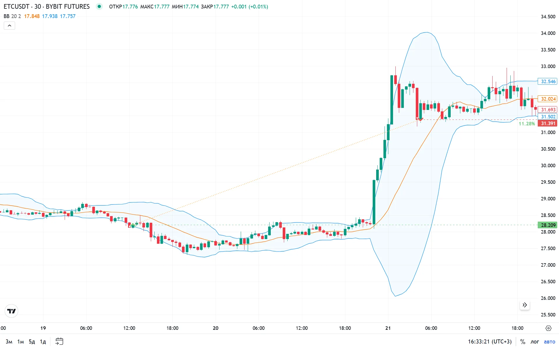 Первый ориентир — полосы Боллинджера на 30-минутном таймфрейме (M30). Этот индикатор строится на основе скользящей средней и отражает волатильность рынка. Полосы показывают, где цена отклоняется от нормы: