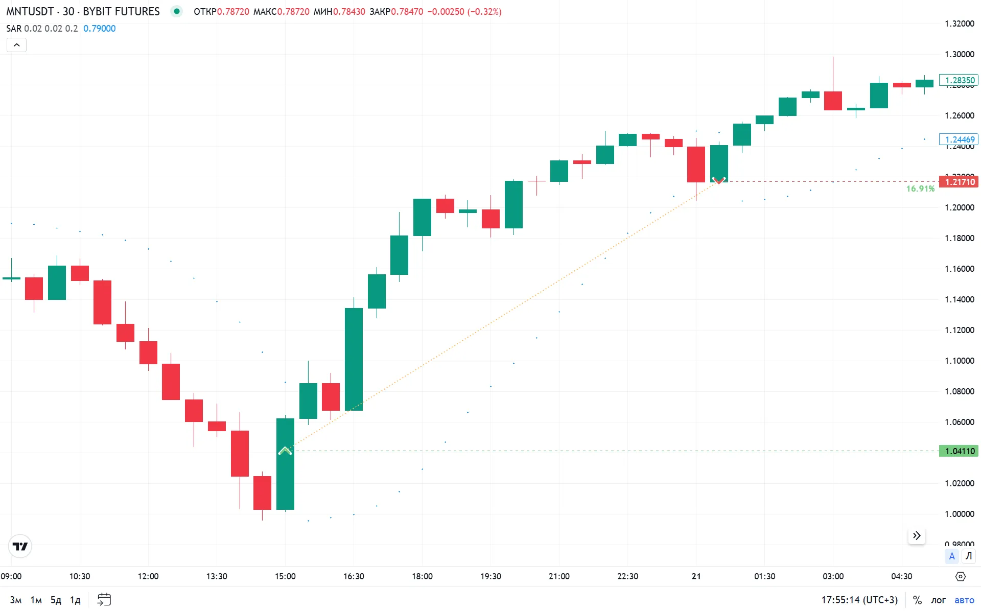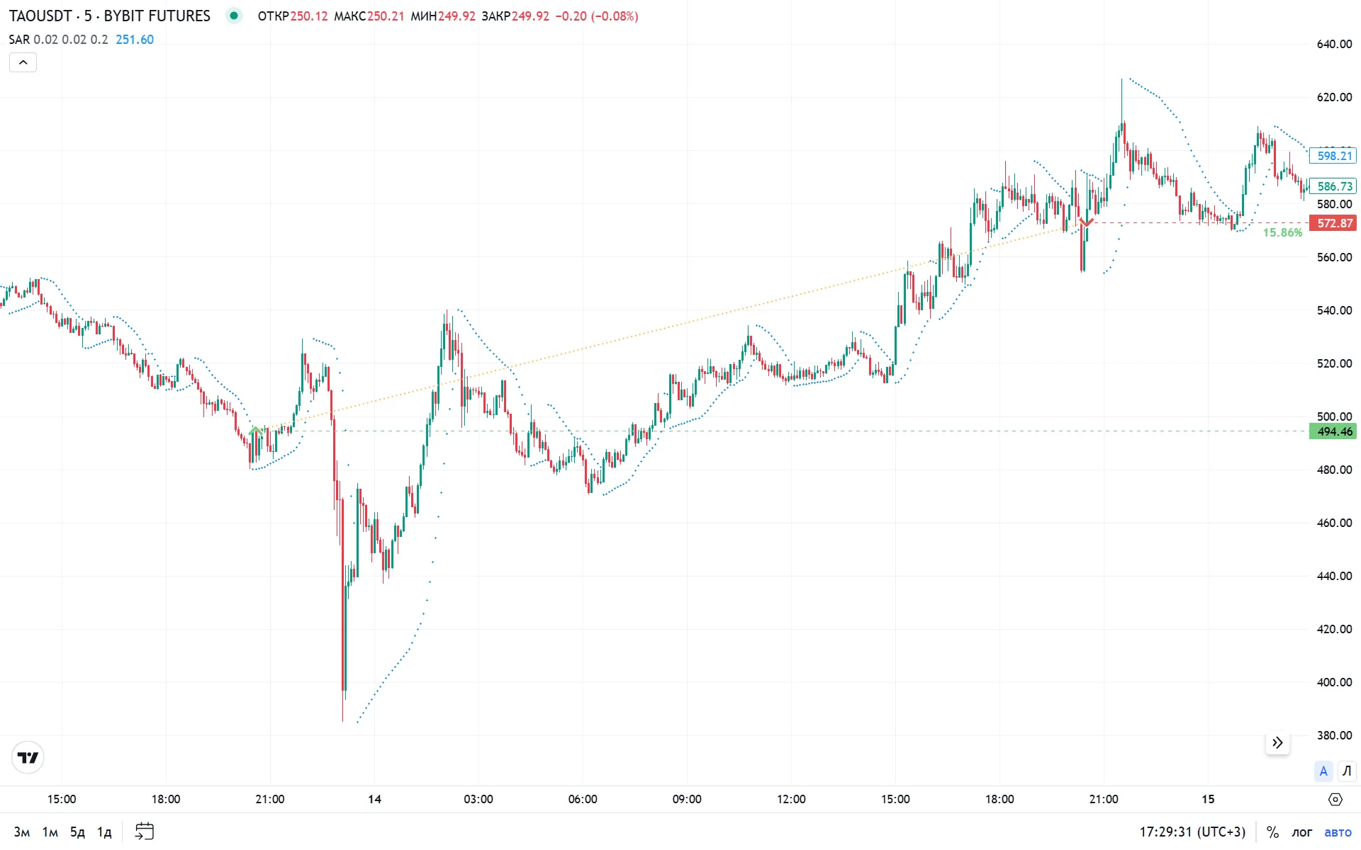 Особенность Vega — использование Parabolic SAR (Stop And Reverse). Этот индикатор отслеживает направление движения: точки под ценой сигнализируют о росте, над ценой — о падении. Vega применяет SAR на двух таймфреймах.