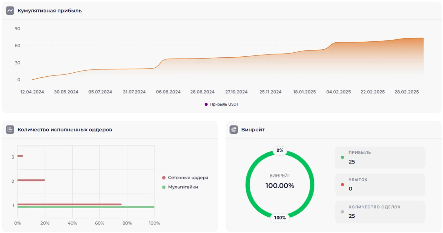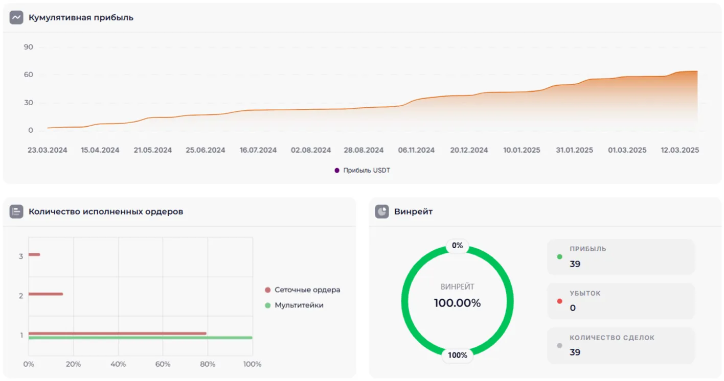 Vega заботится о вашем капитале. Для фиксации прибыли она следит за пересечением точек Parabolic SAR: смена направления — повод закрыть позицию. Если рынок колеблется, включается сетка усреднения, основанная на RSI и полосах Боллинджера. Она позволяет докупать актив на просадках, снижая среднюю цену позиции. Это как страховка для новичков, которые ещё не привыкли к резким поворотам крипторынка.