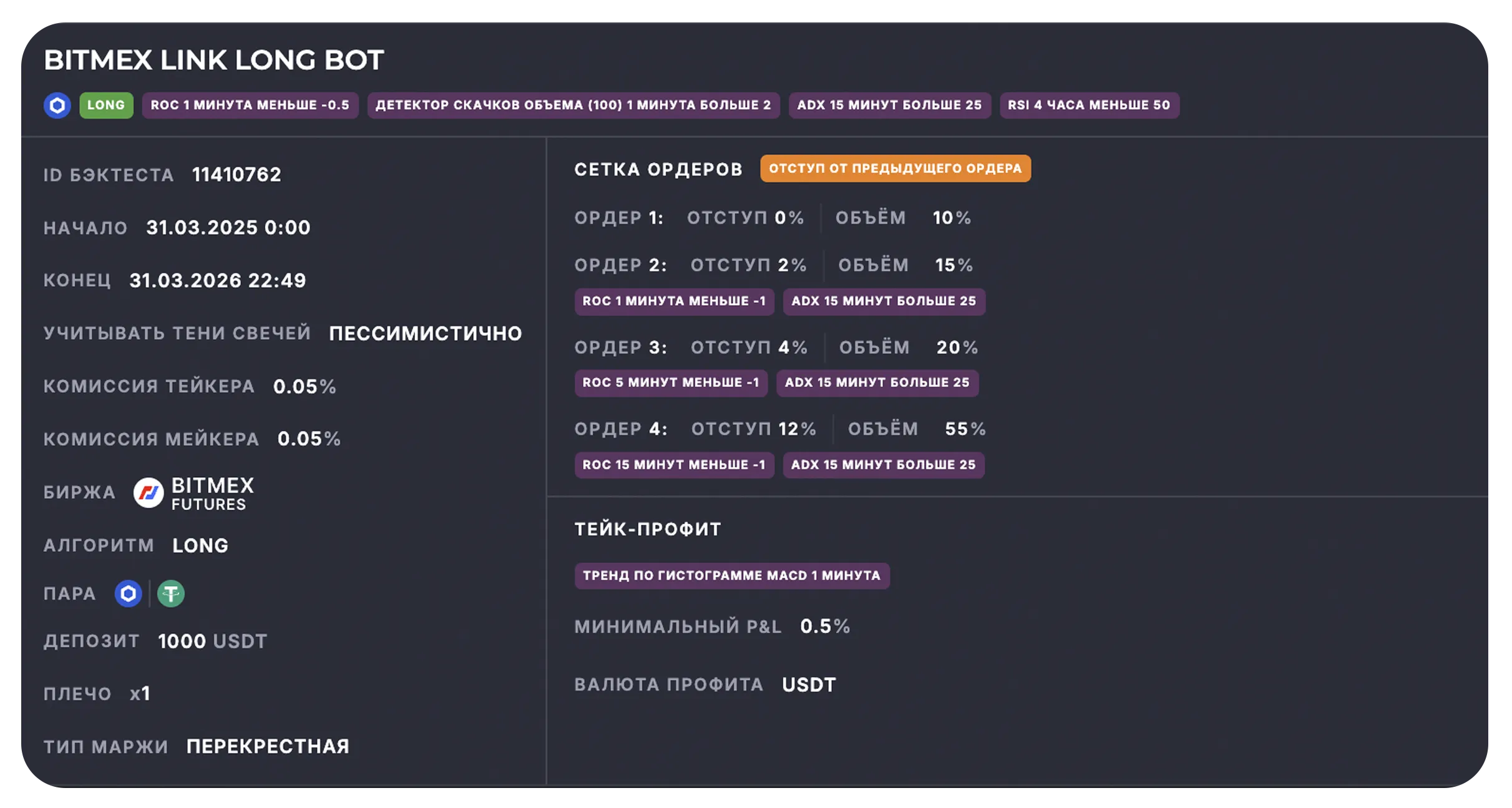 | Bitmex LINK Long Bot | 38.79% | -256.4 USDT/-57.45% | 13 дней |