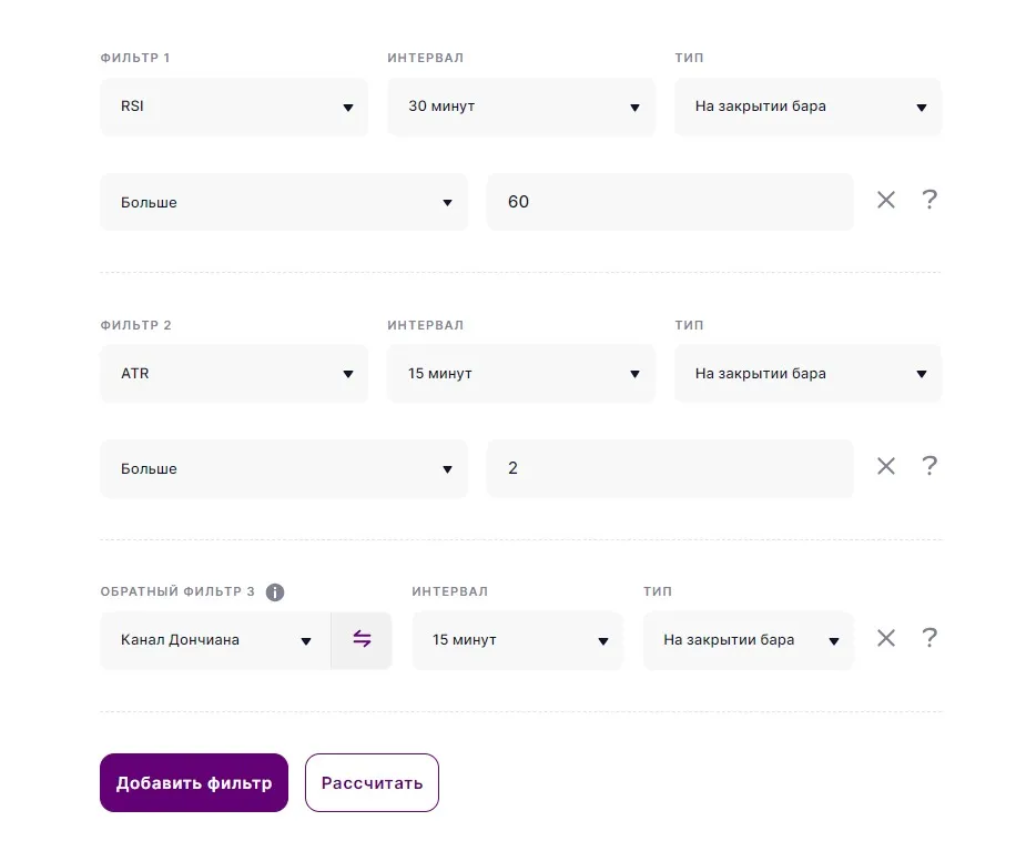Например, трейдер определил для себя, что выбранный им актив пробивает свои уровни только в том случае, когда индикатор RSI на 30-ти минутном таймфрейме показывает перекупленность, значение ATR выше 2 и когда пробивается канал Дончиана. И что самое важное, все эти основания должны быть удовлетворены.