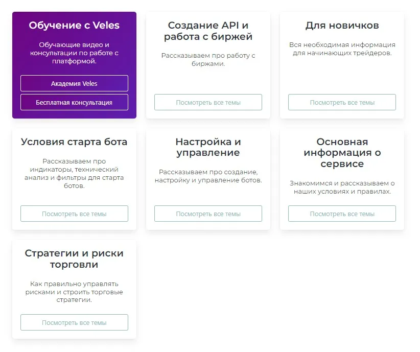 Для пользователей, которые только начинают знакомиться с рынком и его особенностями, существует Veles Wiki. Здесь пользователь может найти подробные инструкции, начиная с процесса создания API ключа на бирже и заканчивая разбором торговых индикаторов.