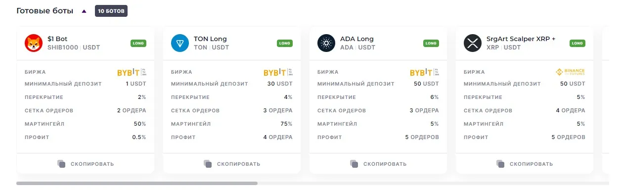 На платформе Veles также есть готовые криптовалютные боты с настройками, которые доказали свою эффективность на дистанции. Пользователю нет необходимости анализировать рынок, настраивать индикаторы и искать моменты входа. Алгоритмы ботов справятся с этой задачей.