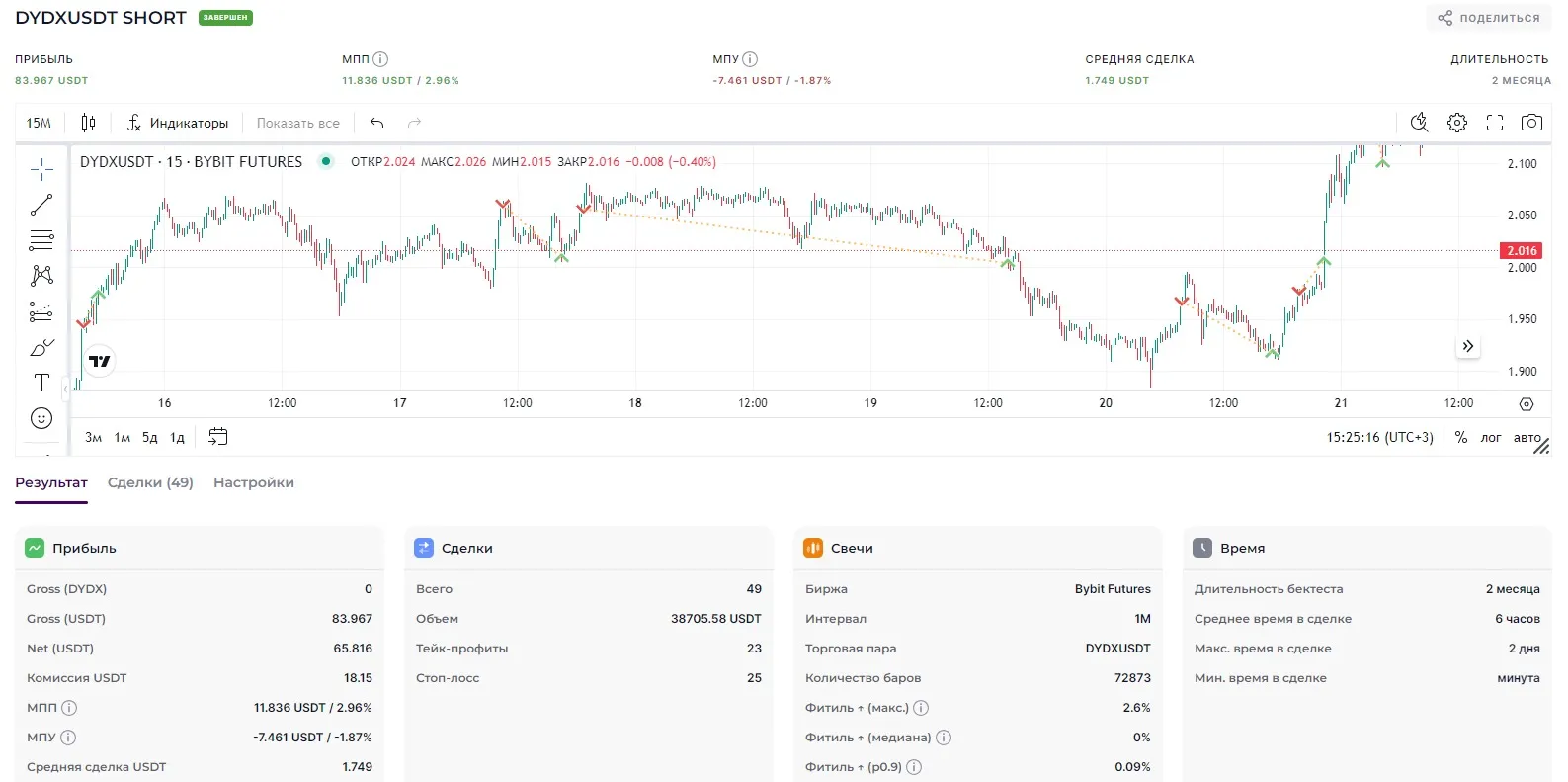 Пользователи могут использовать бектесты, чтобы проверить свои торговые стратегии на прошлых данных и проанализировать соотношение прибыли к убытку. Благодаря миллиардам свечей и сотням комбинаций индикаторов пользователи получают полное представление о рынке, что помогает им принимать обоснованные торговые решения.