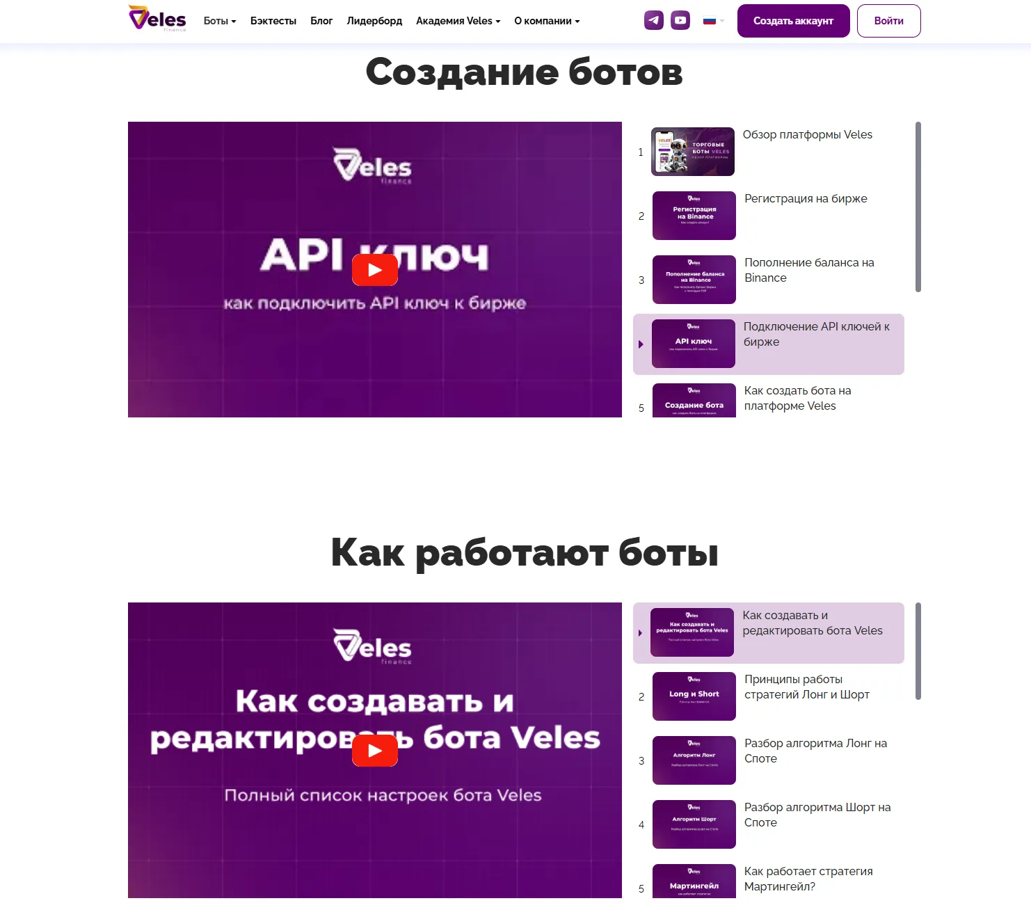 В Veles Academy подробно объясняется, как создать торгового бота за несколько шагов. На платформе есть пошаговые инструкции по подключению биржи, настройке параметров и выбору стратегии.