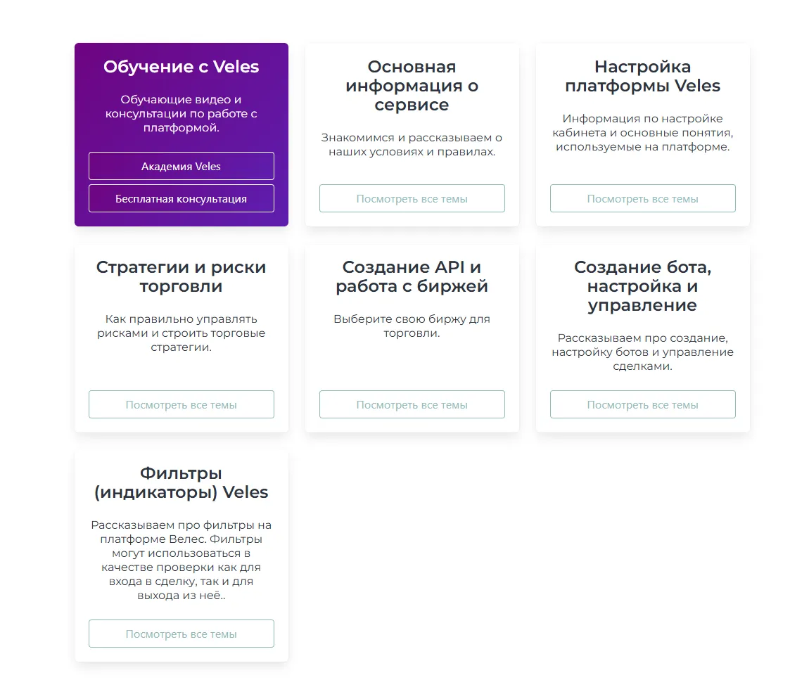 Если вы хотите понять, как эффективно использовать торгового бота Veles, настроить стратегию и управлять рисками, то лучше всего начать с Veles Academy — обучающего раздела платформы, который доступен на официальном сайте Veles. Здесь собраны материалы, помогающие начинающим трейдерам/инвесторам освоить работу с ботами, разобраться в торговых индикаторах и научиться применять на практике профессиональные стратегии.
