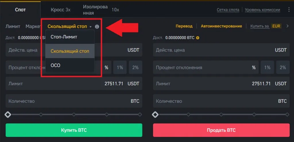 На большинстве бирж есть отдельная кнопка или опция в форме выставления ордера. Также это можно сделать через торговый бот с трейлинг-стопом, задав параметры в интерфейсе.