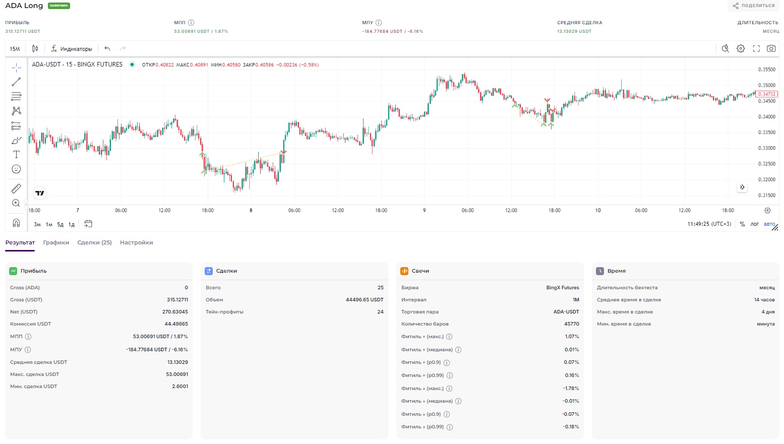 Пользователи могут проводить бэктесты, чтобы оценить свои стратегии на исторических данных и рассчитать соотношение прибыли к убытку. Огромный набор свечей и комбинаций индикаторов дает трейдерам глубокое понимание рынка, помогая им принимать обоснованные решения.